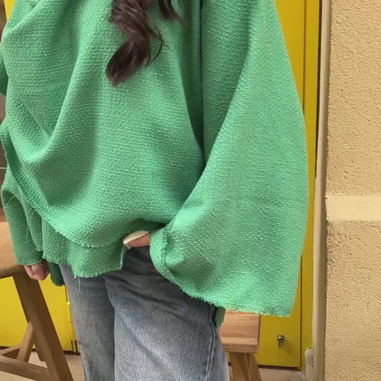 A statement piece that takes layering to the next level. Designed with a built-in scarf, this top features a high-low hem, wide sleeves, and raw edge detailing for a modern, laid-back feel.